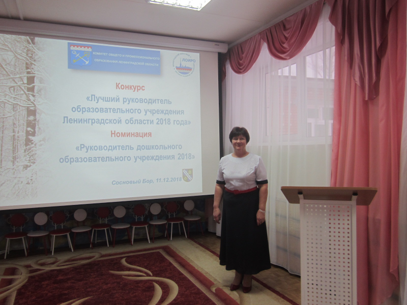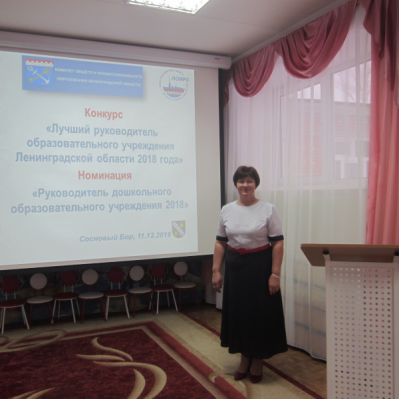 11 декабря 2018 года в МБДОУ «Детский сад № 3» г. Сосновый Бор прошел областной конкурс "Лучший руководитель образовательного учреждения Ленинградской области» в номинации «Руководитель дошкольного образовательного учреждения». Участниками конкурса стали 10 заведующих дошкольными учреждениями из Подпорожского, Лужского, Волосовского, Гатчинского, Приозерского, Ломоносовского, Волховского, Выборгского, Сосновоборского и Всеволожского районов.